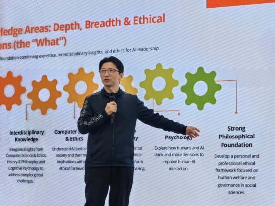 谭辉教授以历史的纵深视角,指出当前人工智能革命带来的变革深度与广度已远超工业革命。面对这一时代潮流,他系统阐述了本科生应如何构建不可替代的核心竞争力这一话题,强调当知识获取因AI而日趋“平权化”,教育的核心必须从知识传授转向高阶能力的培养。他鼓励员工主动学习并驾驭AI工具,将其转化为强大助力,注重提高沟通、共情与表达能力,以及持续学习、灵活应变的素质。谈及思维模式,他引入了“网络化思维”与“前瞻性规划”理念,建议员工从本科阶段即有意识地整合资源、规划路径,为长远发展筑基。